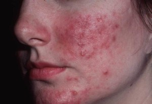 Es una enfermedad crónica de la piel que presenta remisiones y recaídas o etapas de agudización , se presenta como un enrojecimiento en la parte central de la cara especialmente en la nariz, hay eritema, papulas, telangiectasias o venitas dilatadas, pústulas y en ocasiones enrojecimiento ocular con ardor y prurito La rosácea comúnmente puede confundirse con el acné que aparece en la edad adulta, por dichas lesiones papulares y nodulares. Es importante que la Rosácea se atienda ya que puede progresar a etapas más severas.